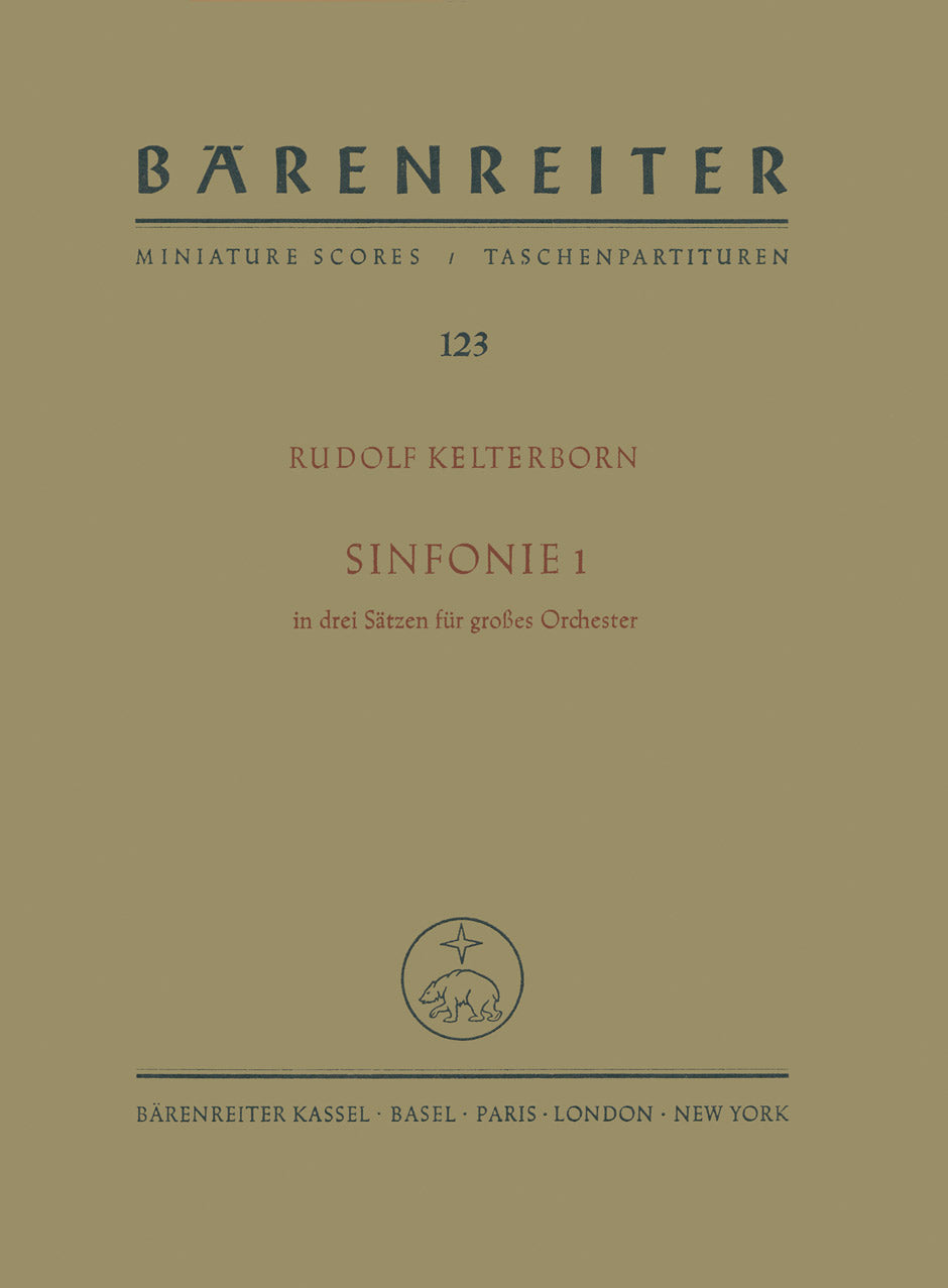 **Title**: Sinfonie I in drei Sätzen (1966/1967) | **Comments**: Uraufführung 05.01.1968, Zürich | **Composer / Author**: Kelterborn, Rudolf | **Edition Type**: Study score | **Instrumentation**: Orchestra | **Binding**: Stapled | **Duration**: 00:20:00 | **Weight**: 214.0 g | **Format**: 22,6 x 16,7 cm | **Pages**: 103 S. | **Language**: EN | Sample: https://data.baerenreiter.com/NB/TP/TP00123_00_9790006201013_nb_lrg_01.jpg