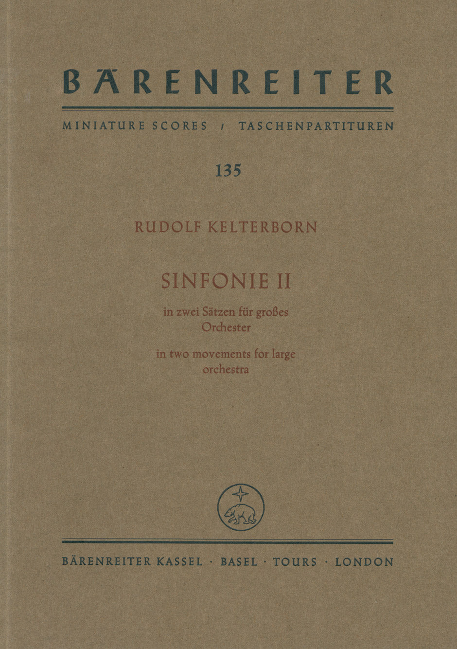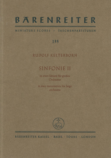 **Title**: Sinfonie II in zwei Sätzen (1969/1970) | **Comments**: Uraufführung 22.10.1970, München | **Composer / Author**: Kelterborn, Rudolf | **Edition Type**: Study score | **Instrumentation**: Orchestra | **Binding**: Stapled | **Duration**: 00:19:00 | **Weight**: 203.0 g | **Format**: 22,4 x 16,5 cm | **Pages**: 105 S. | **Language**: EN | Sample: https://data.baerenreiter.com/NB/TP/TP00135_00_9790006201136_nb_lrg_01.jpg