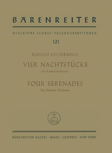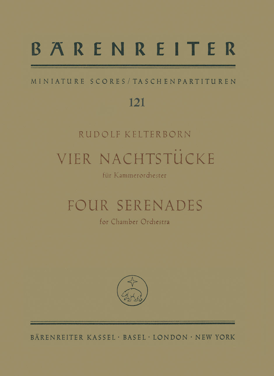 **Title**: Vier Nachtstücke für Kammerorchester (1963) | **Comments**: Uraufführung 11.12.1963, Zürich | **Composer / Author**: Kelterborn, Rudolf | **Edition Type**: Study score | **Binding**: Stapled | **Duration**: 00:13:00 | **Weight**: 50.0 g | **Format**: 18,5 x 13,0 cm | **Pages**: 35 S. | **Language**: EN | Sample: https://data.baerenreiter.com/NB/TP/TP00121_00_9790006200993_nb_lrg_01.jpg