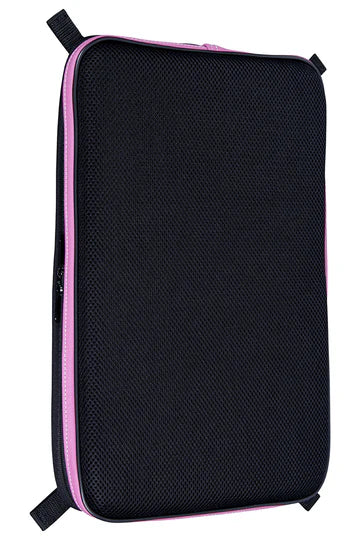 Back cushion with integrated music pouch lined with L'Etoile color for contoured violin and viola case. This product attaches to the case using Velcro fasteners to the D-rings.