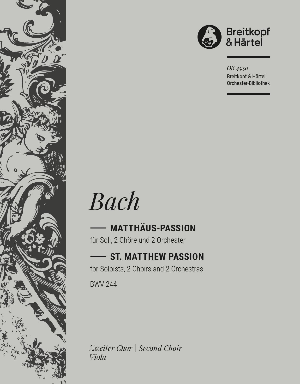 St. Matthew Passion BWV 244 | solos,dble mix ch,2orch | solos: SSATTBB – choir: SATB/SATB – 4(2rec).4(2ob d’am.2ob da cac).0(2) – 0.0.0.0 – str(vagb) – bc | Choir | Chorus | Chorus (with soloists) and orchestra | 200' | Baroque | Oratorio/passion | Sheet Music | viola | choir 2 | | | 16 | stapled | 25 x 32 cm