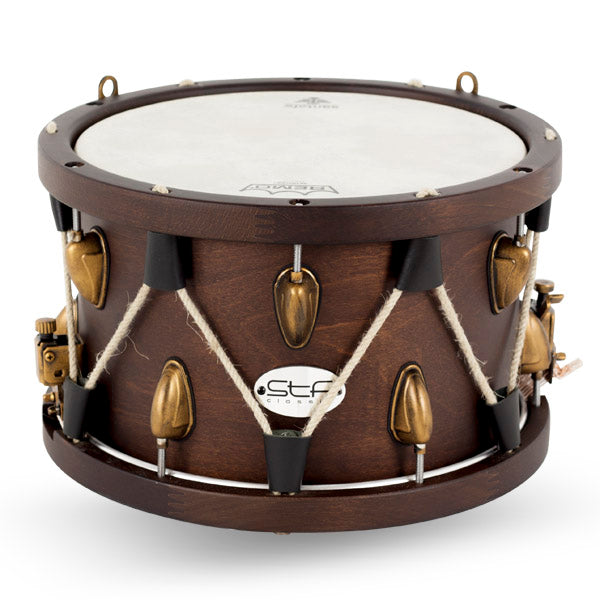 Birch shell 8mm ( 5 ply). Super maple custom hoops. Remo drumheads: Remo Fiberskin batter + mufle + Remo UT Ambassador snare. Weigth: 2,87Kg. Stf Classic.