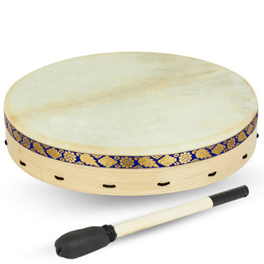 Panderos / tambores chamanicos de 18". 45x7,5cm. Parche piel. Con diseño de cinta de pasamanería. Incluye maza y funda. Cuerpo de fresno (Ash Wood). Acabado mate. Peso: 0.9Kg.