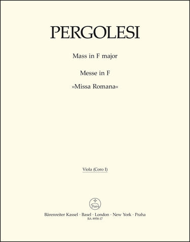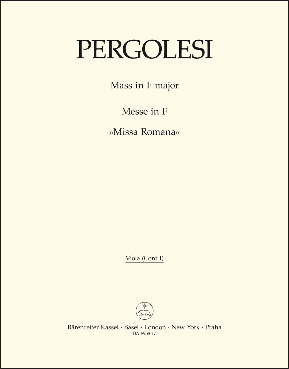 **Title**: Mass in F major "Missa Romana" | **Composer / Author**: Pergolesi, Giovanni Battista | **Editor**: Bruno, Malcolm / Ritchie, Caroline | **Edition Type**: Part, Urtext edition | **Scoring/ Instrumentation**: Viola (Choir I) | **Binding**: Stapled | **Level of Difficulty**: 3.0 | **Weight**: 66.0 g | **Format**: 32,5 x 25,5 cm | **Pages**: 15 S. | **Language**: EN | Sample: https://data.baerenreiter.com/NB/BA/BA08958_17_9790006557653_nb_lrg_01.jpg