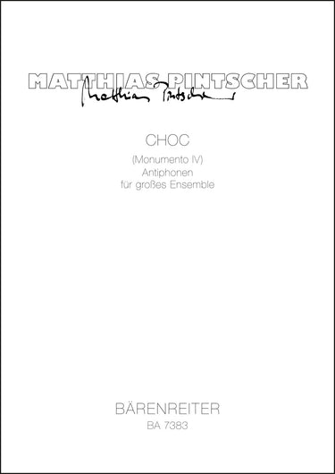**Title**: CHOC (Monumento IV) (1996) | **Subtitle**: Antiphonen für großes Ensemble | **Comments**: Uraufführung 02.06.1997, Köln | **Composer / Author**: Pintscher, Matthias | **Edition Type**: Study score | **Binding**: Stapled | **Duration**: 00:20:00 | **Printing**: 8. Aufl. 2016 | **Weight**: 460.0 g | **Format**: 41,8 x 29,5 cm | **Pages**: 66 S. | **Language**: EN | Sample: https://data.baerenreiter.com/NB/BA/BA07383_00_9790006504275_nb_lrg_01.jpg