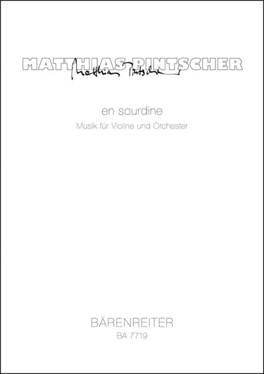 **Title**: en sourdine (2002) | **Subtitle**: Musik für Violine und Orchester | **Comments**: Uraufführung 27.02.2003, Berlin | **Composer / Author**: Pintscher, Matthias | **Edition Type**: Study score | **Instrumentation**: Violin, Orchestra | **Scoring/ Instrumentation**: Violin, Orchestra | **Binding**: Stapled | **Duration**: 00:23:00 | **Printing**: 6. Aufl. 2017 | **Weight**: 465.0 g | **Format**: 41,8 x 29,7 cm | **Pages**: 66 S. | **Language**: EN | Sample: https://data.baerenreiter.com/NB/BA/BA07719_00_9790006530939_nb_lrg_01.jpg