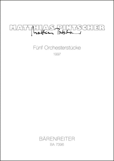 **Title**: Fünf Orchesterstücke (1997) | **Comments**: Uraufführung 01.08.1997, Salzburg | **Composer / Author**: Pintscher, Matthias | **Edition Type**: Score | **Instrumentation**: Orchestra | **Scoring/ Instrumentation**: Orchestra | **Binding**: Ring stitching | **Duration**: 00:20:00 | **Printing**: 9. Aufl. 2018 | **Weight**: 538.0 g | **Format**: 42,0 x 30,3 cm | **Pages**: 85 S. | **Language**: EN | Sample: https://data.baerenreiter.com/NB/BA/BA07396_00_9790006501885_nb_lrg_01.jpg