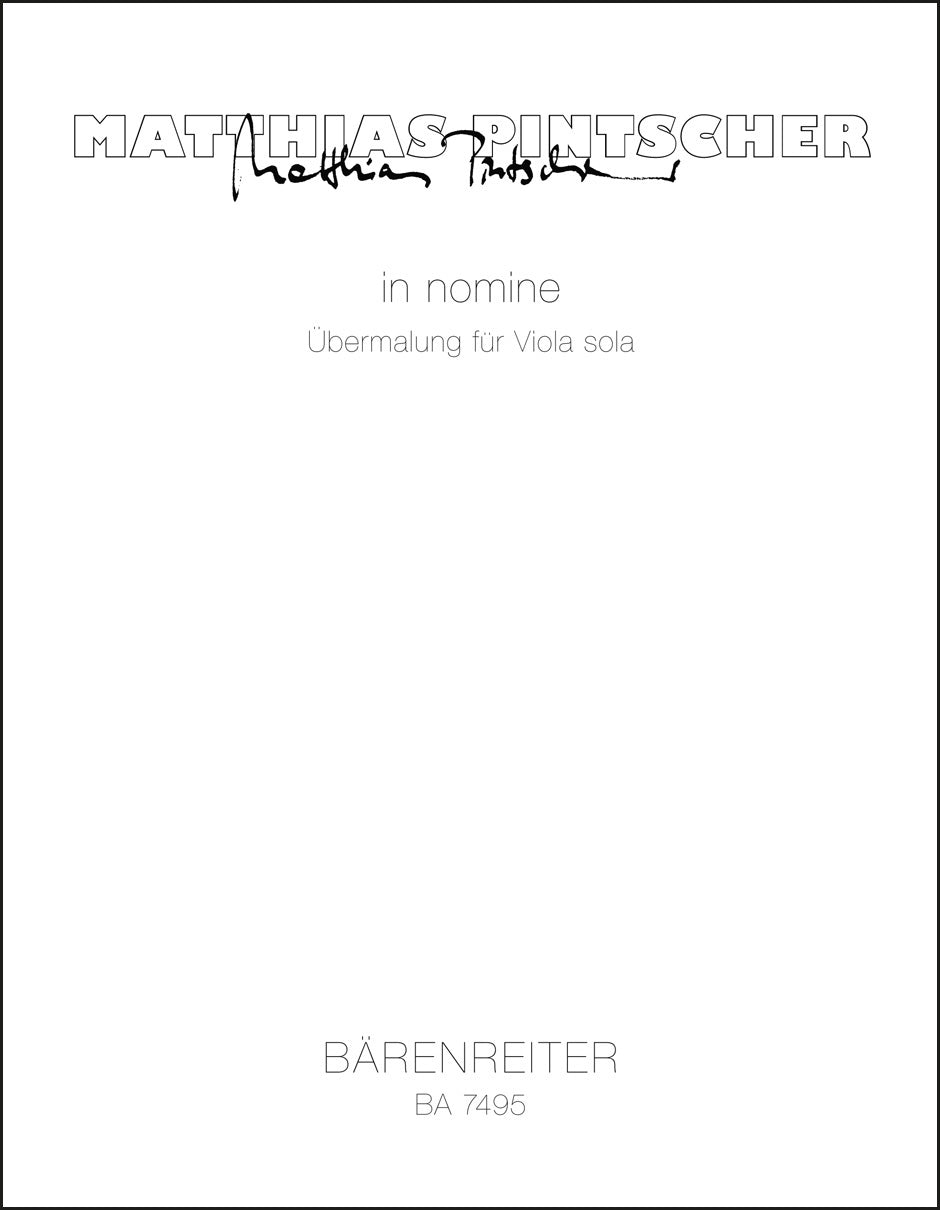 **Title**: in nomine (1999) | **Subtitle**: Übermalung for viola solo | **Composer / Author**: Pintscher, Matthias | **Edition Type**: Performance score | **Instrumentation**: Viola | **Scoring/ Instrumentation**: Viola | **Binding**: Stapled | **Duration**: 00:06:00 | **Printing**: 8th printing 2017 | **Weight**: 77.0 g | **Format**: 38,0 x 29,5 cm | **Pages**: 5 S. | **Language**: EN | Sample: https://data.baerenreiter.com/NB/BA/BA07495_00_9790006505593_nb_lrg_01.jpg