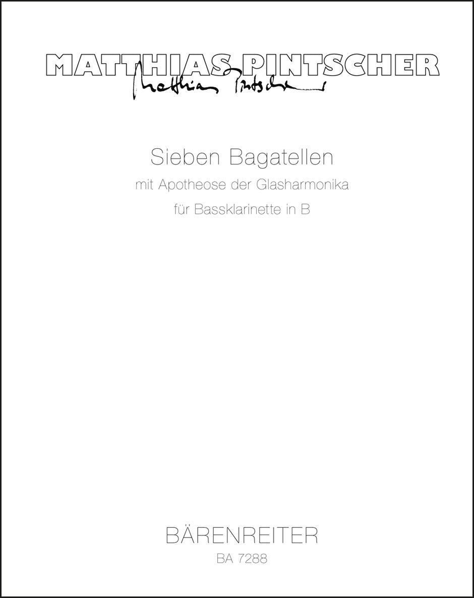 **Title**: Sieben Bagatellen mit Apotheose der Glasharmonika für Bassklarinette in B (1993 (rev. 2001)) | **Comments**: Uraufführung 10.01.2003, Paris | **Composer / Author**: Pintscher, Matthias | **Edition Type**: Performance score | **Instrumentation**: Clarinet | **Scoring/ Instrumentation**: Bass clarinet (in B-flat) | **Binding**: Ring stitching | **Duration**: 00:17:00 | **Printing**: 8. Aufl. 2018 | **Weight**: 116.0 g | **Format**: 34,0 x 27,5 cm | **Pages**: 16 S. | **Language**: EN | Sample: https://data.baerenreiter.com/NB/BA/BA07288_00_9790006499632_nb_lrg_01.jpg
