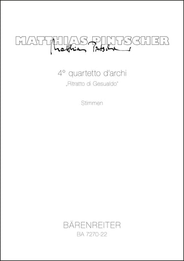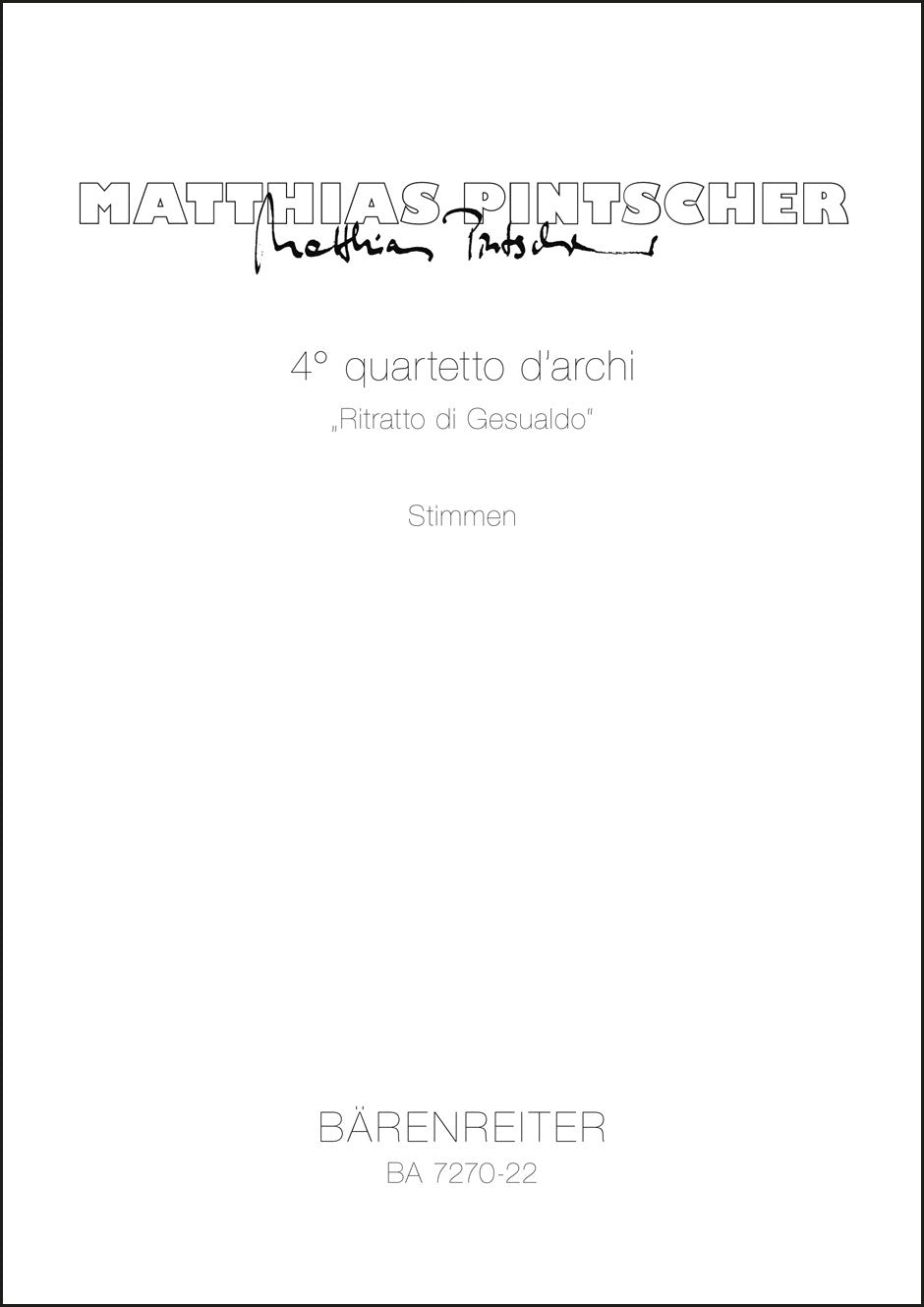 **Title**: 4. quartetto d'archi - Ritratto di Gesualdo (1992) | **Subtitle**: 4 für jedes Instrument individuell eingerichtete Spielpartituren | **Comments**: Uraufführung 06.04.1995, Hamburg | **Composer / Author**: Pintscher, Matthias | **Edition Type**: Set of parts | **Instrumentation**: String quartet | **Scoring/ Instrumentation**: Violins (2), Viola, Violoncello | **Binding**: Stapled | **Duration**: 00:27:00 | **Printing**: 2. Aufl. 2018 | **Weight**: 631.0 g | **Format**: 39,0 x 28,0 cm | **Pages**: 27/24/27/27 S. | **Language**: EN | Sample: https://data.baerenreiter.com/NB/BA/BA07270_22_9790006500666_nb_lrg_01.jpg
