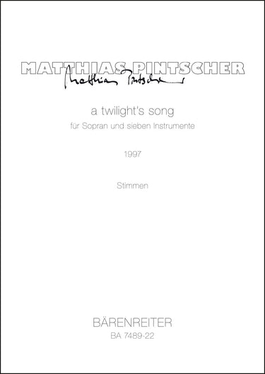 **Title**: a twilight's song für Sopran und sieben Instrumente (1997) | **Comments**: Uraufführung 28.04.1998, München | **Composer / Author**: Pintscher, Matthias | **Edition Type**: Set of parts | **Scoring/ Instrumentation**: Viola, Violoncello, Bass flute, Bass clarinet, Harp, Piano, Drums | **Binding**: Stapled | **Printing**: 3. Aufl. 2013 | **Weight**: 300.0 g | **Format**: 42,0 x 29,5 cm | **Pages**: 3/3/5/5/5/5/4 S. | **Language**: EN | Sample: https://data.baerenreiter.com/NB/BA/BA07489_22_9790006503391_nb_lrg_01.jpg