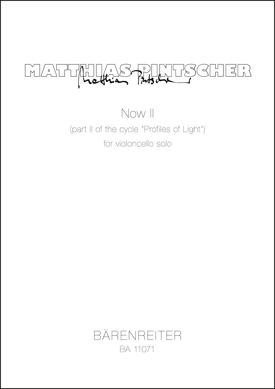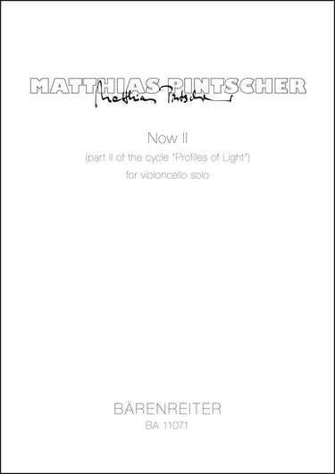 **Title**: Now II for violoncello solo (2015) | **Misc Information**: part II of the cycle "Profiles of Light" | **Composer / Author**: Pintscher, Matthias | **Edition Type**: Performance score | **Instrumentation**: Violoncello | **Scoring/ Instrumentation**: Violoncello | **Binding**: in a folder | **Level of Difficulty**: 5.0 | **Printing**: 4th printing 2020 | **Weight**: 105.0 g | **Format**: 42,0 x 29,7 cm | **Pages**: 4 S. | **Language**: EN | Sample: https://data.baerenreiter.com/NB/BA/BA11071_00_9790006562015_nb_lrg_01.jpg