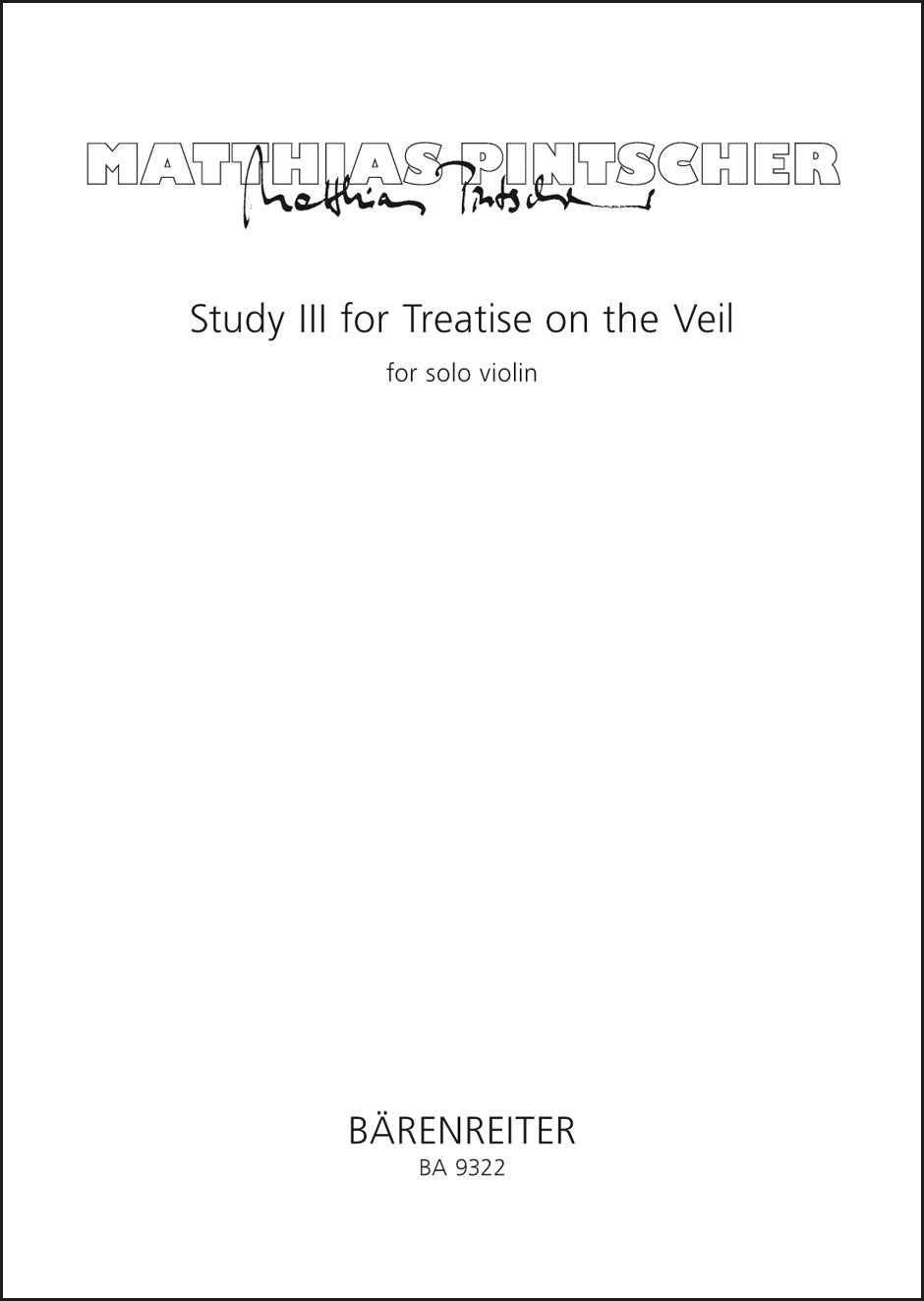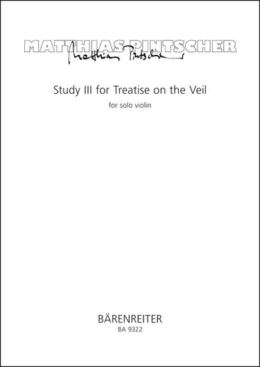 **Title**: Study III for Treatise on the Veil for solo violin (2007) | **Composer / Author**: Pintscher, Matthias | **Edition Type**: Performance score | **Instrumentation**: Violin | **Scoring/ Instrumentation**: Violin solo | **Binding**: Stapled | **Duration**: 00:10:00 | **Printing**: 4th printing 2018 | **Weight**: 140.0 g | **Format**: 42,0 x 29,5 cm | **Pages**: 6 S. | **Language**: EN | Sample: https://data.baerenreiter.com/NB/BA/BA09322_00_9790006537143_nb_lrg_01.jpg