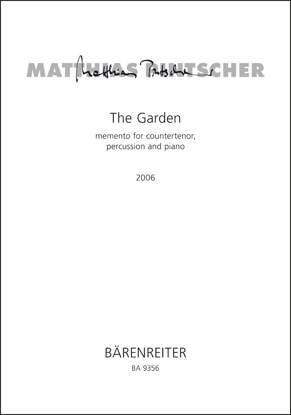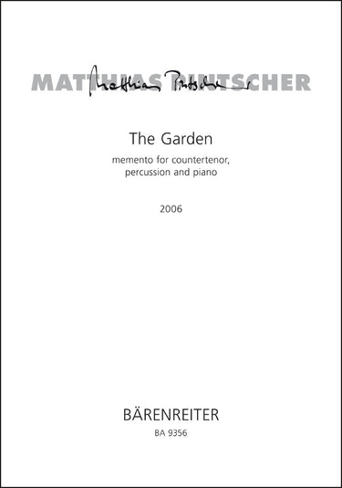 **Title**: The Garden - memento for countertenor, percussion and piano (2006) | **Comments**: Uraufführung 04.02.2007, Stuttgart | **Composer / Author**: Pintscher, Matthias | **Edition Type**: Score | **Scoring/ Instrumentation**: Soprano solo, Percussion, Piano | **Binding**: Stapled | **Duration**: 00:08:00 | **Printing**: 1. Aufl. 2007 | **Weight**: 148.0 g | **Format**: 42,0 x 29,8 cm | **Pages**: 6 S. | **Language**: EN | Sample: https://data.baerenreiter.com/NB/BA/BA09356_00_9790006536269_nb_lrg_01.jpg