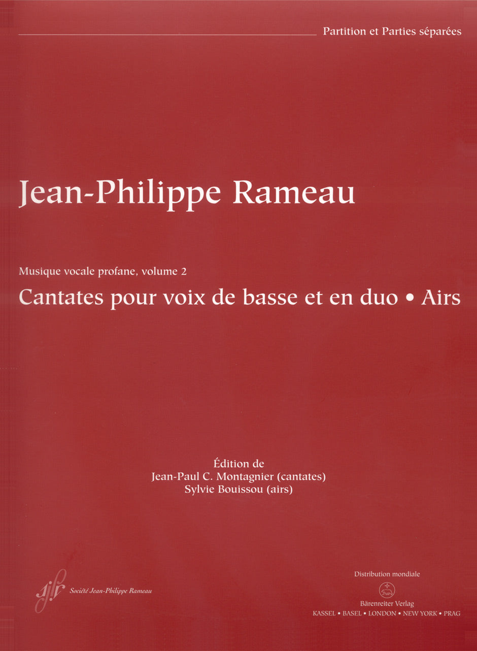 **Title**: Cantates pour voix de basse et en duo, Airs | **Comments on Version**: prakt. Ausgabe/ Gesamtausgaben-Band (Leinen) hierzu: BA 8855 | **Composer / Author**: Rameau, Jean-Philippe | **Editor**: Bouissou, Sylvie / Montagnier, Jean-Paul C. | **Edition Type**: Score, Set of parts, Urtext edition, Anthology | **Scoring/ Instrumentation**: Low voice, High voice, Alto solo, 1. Violin (Flute), 2. Violin, Basso continuo, Bass viola da gamba | **Binding**: Paperback | **Printing**: 1st printing 2009 | **Weight**: 859.0 g | **Format**: 33,5 x 24,0 cm | **Pages**: X, 95/16/3/25/19/3/45 | **Language**: EN | Sample: https://data.baerenreiter.com/NB/BA/BA08948_00_9790006538133_nb_lrg_01.jpg