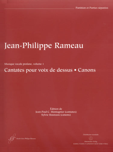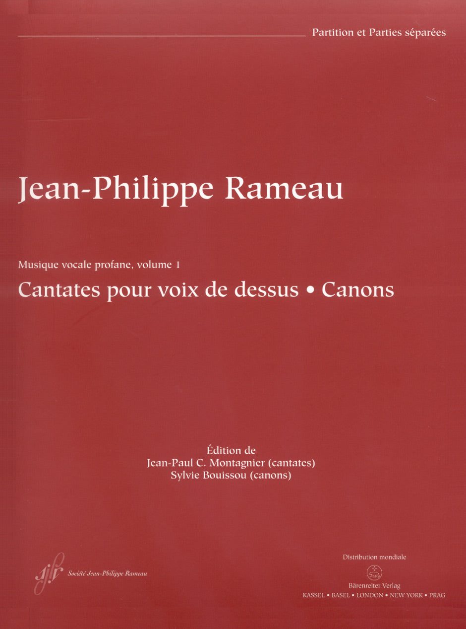 **Title**: Cantates pour voix de dessus | **Subtitle**: Canons | **Composer / Author**: Rameau, Jean-Philippe | **Editor**: Bouissou, Sylvie / Montagnier, Jean-Paul C. | **Edition Type**: Score, Set of parts, Urtext edition, Anthology | **Scoring/ Instrumentation**: High voice, Flute, Violins (2), Basso continuo (beziffert) | **Binding**: Paperback | **Printing**: 1st printing 2009 | **Weight**: 921.0 g | **Format**: 33,4 x 24,2 cm | **Pages**: X, 110/33/3/24/8/48 | **Language**: EN | Sample: https://data.baerenreiter.com/NB/BA/BA08946_00_9790006538126_nb_lrg_01.jpg