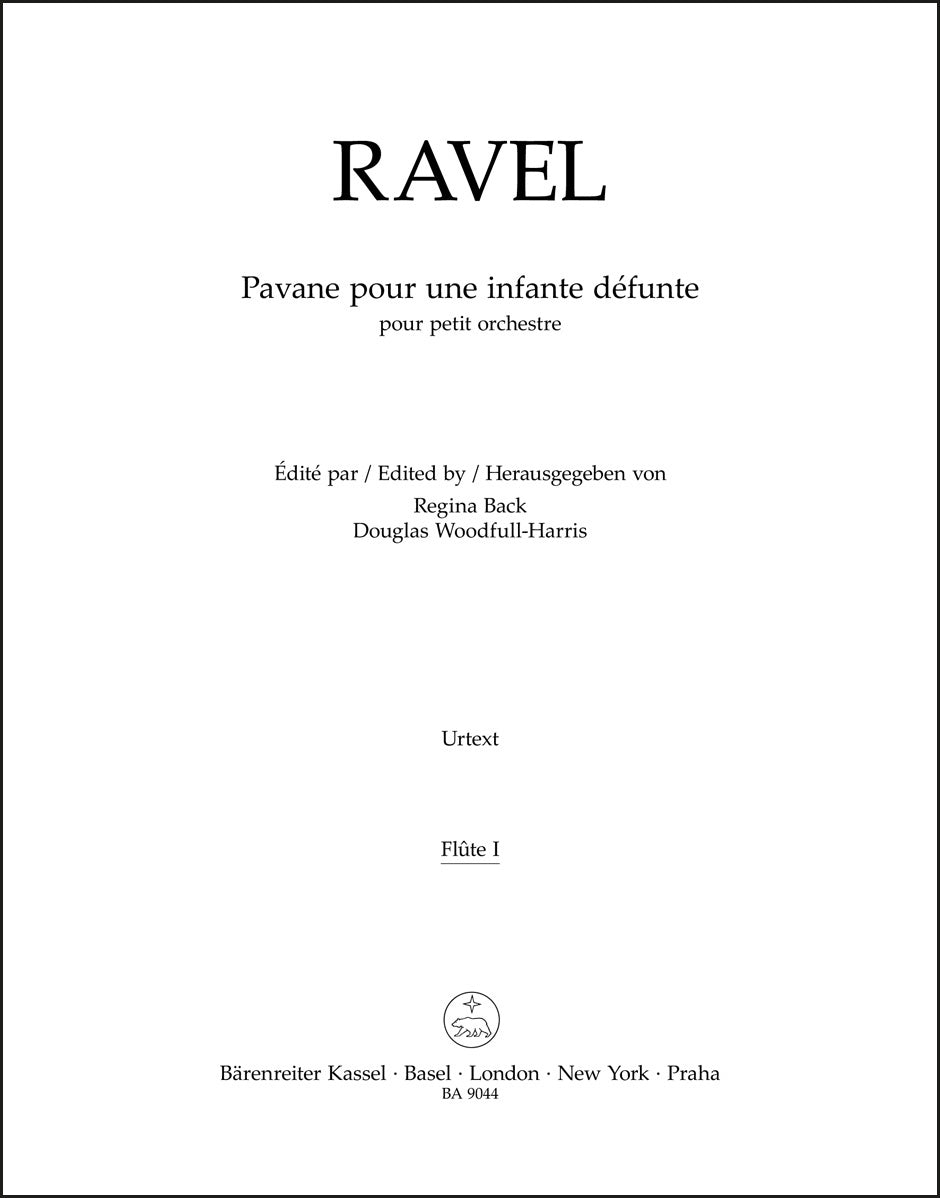 **Title**: Pavane for a Dead Princess for small orchestra | **Composer / Author**: Ravel, Maurice | **Editor**: Back, Regina / Woodfull-Harris, Douglas | **Edition Type**: Wind set, Urtext edition | **Instrumentation**: Small orchestra | **Scoring/ Instrumentation**: Flutes (2), Oboe, Clarinets (2), Bassoons (2), Natural horns (2), Horns (2), Harp, Piano | **Binding**: Folded | **Weight**: 203.0 g | **Format**: 32,5 x 25,5 cm | **Pages**: 1/1/1/1/1/1/1/1/1/1/3/3 S. | **Language**: EN | Sample: https://data.baerenreiter.com/NB/BA/BA09044_65_9790006536658_nb_lrg_01.jpg