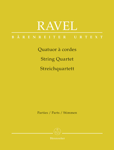 **Title**: String Quartet | **Composer / Author**: Ravel, Maurice | **Editor**: Appold, Juliette | **Edition Type**: Set of parts, Urtext edition | **Instrumentation**: String quartet | **Scoring/ Instrumentation**: Violins (2), Viola, Violoncello | **Binding**: in a folder | **Printing**: 4th printing 2024 | **Weight**: 269.0 g | **Format**: 31,0 x 24,3 cm | **Pages**: 15/14/16/11 S. | **Language**: EN | Sample: https://data.baerenreiter.com/NB/BA/BA09413_00_9790006532643_nb_lrg_01.jpg