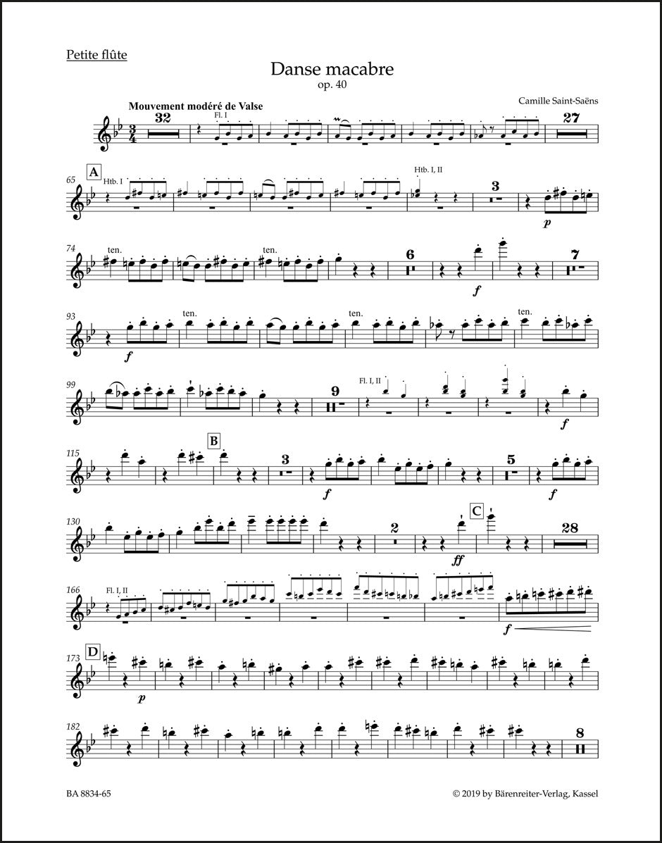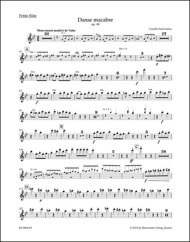 **Title**: Danse macabre op. 40 | **Subtitle**: Symphonic poem after a poem by Henri Cazalis | **Composer / Author**: Saint-Saëns, Camille | **Editor**: Macdonald, Hugh | **Edition Type**: Wind set, Urtext edition | **Scoring/ Instrumentation**: Piccolo flute, Flutes (2), Oboes (2), Clarinets (2), Bassoons (2), Horns (4), Trumpets (2), Trombones (3), Tuba, Timpani, Percussion (Cymbals, Triangle, Concert bass drum, Xylophone), Harp | **Binding**: Folded | **Weight**: 392.0 g | **Format**: 32,5 x 25,5 cm | **Pages**: 3/3/3/4/4/4/3/4/3/3/3/3/3/3/3/3/3/3/3/3/3/3/3 S. | **Language**: EN | Sample: https://data.baerenreiter.com/NB/BA/BA08834_65_9790006567256_nb_lrg_01.jpg
