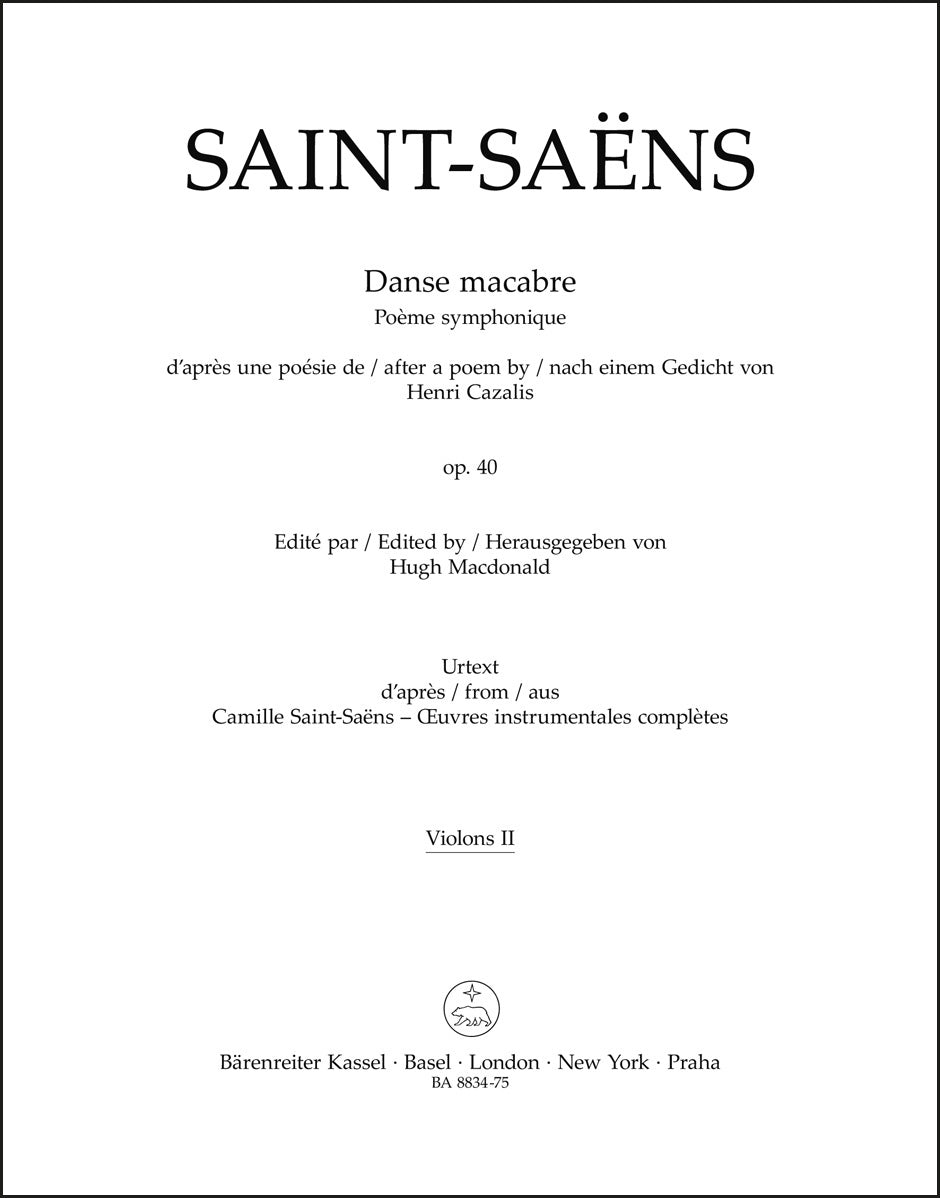 **Title**: Danse macabre op. 40 | **Subtitle**: Symphonic poem after a poem by Henri Cazalis | **Composer / Author**: Saint-Saëns, Camille | **Editor**: Macdonald, Hugh | **Edition Type**: Part, Urtext edition | **Scoring/ Instrumentation**: 2. Violin | **Binding**: Stapled | **Weight**: 33.0 g | **Format**: 32,5 x 25,5 cm | **Pages**: 7 S. | **Language**: EN | Sample: https://data.baerenreiter.com/NB/BA/BA08834_75_9790006567218_nb_lrg_01.jpg