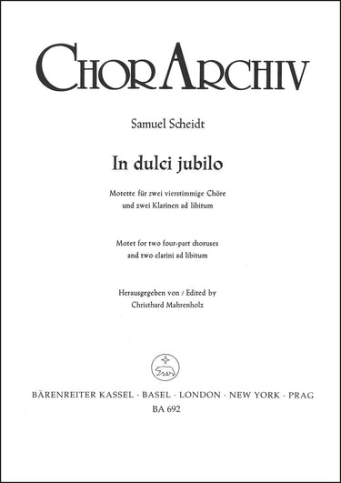 **Title**: In dulci jubilo | **Subtitle**: Motette | **Composer / Author**: Scheidt, Samuel | **Editor**: Mahrenholz, Christhard | **Edition Type**: Score | **Instrumentation**: Choir, Trumpet | **Scoring/ Instrumentation**: Mixed choirs (2), Trumpets (2) | **Binding**: Stapled | **Level of Difficulty**: 4.0 | **Weight**: 28.0 g | **Format**: 27,0 x 19,0 cm | **Pages**: 11 S. | **Language**: EN | Sample: https://data.baerenreiter.com/NB/BA/BA00692_00_9790006404346_nb_lrg_01.jpg