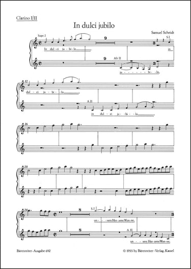 **Title**: In dulci jubilo | **Subtitle**: Motette | **Composer / Author**: Scheidt, Samuel | **Editor**: Mahrenholz, Christhard | **Edition Type**: Part | **Scoring/ Instrumentation**: 1. Trumpet, 2. Trumpet | **Binding**: Stapled | **Weight**: 4.0 g | **Format**: 27,0 x 19,0 cm | **Pages**: 2 S. | **Language**: EN | Sample: https://data.baerenreiter.com/NB/BA/BA00692_52_9790006404353_nb_lrg_01.jpg