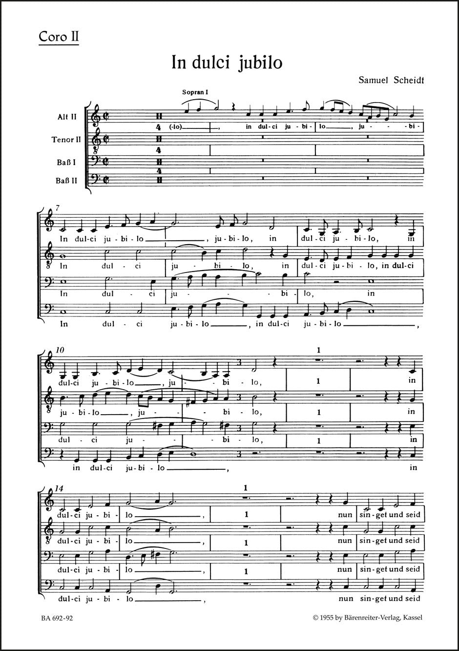 **Title**: In dulci jubilo | **Subtitle**: Motette | **Composer / Author**: Scheidt, Samuel | **Editor**: Mahrenholz, Christhard | **Edition Type**: Choral score | **Instrumentation**: Choir, Trumpet | **Scoring/ Instrumentation**: 2. Mixed choir (SATB) | **Binding**: Stapled | **Weight**: 9.0 g | **Format**: 27,0 x 19,0 cm | **Pages**: 4 S. | **Language**: EN | Sample: https://data.baerenreiter.com/NB/BA/BA00692_92_9790006404377_nb_lrg_01.jpg
