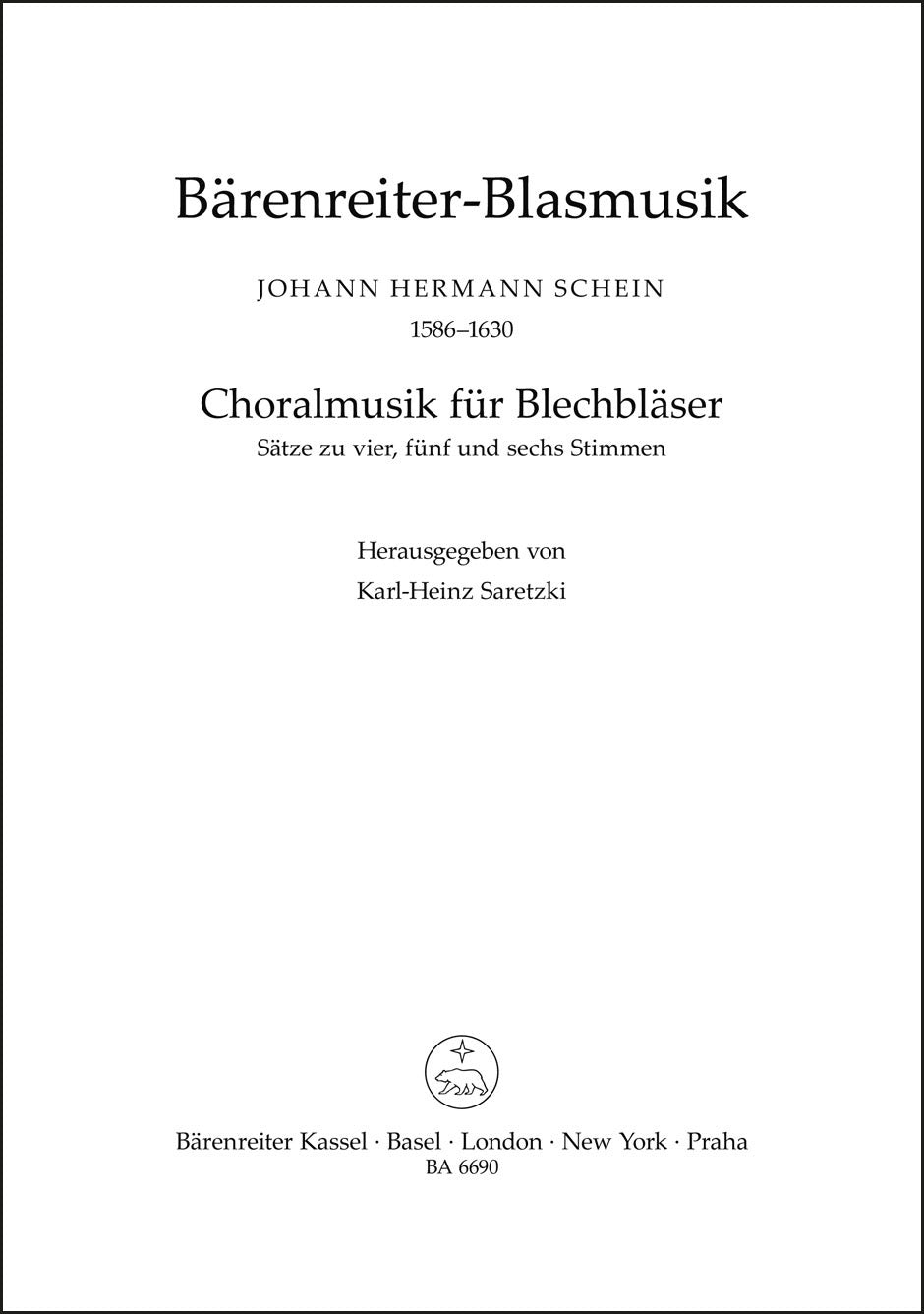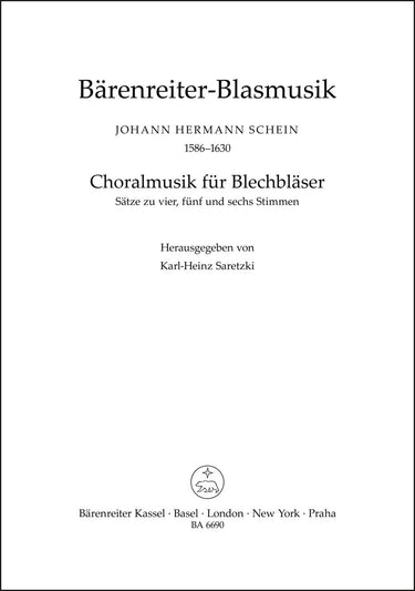 **Title**: Choralmusik für Blechbläser (Posaunenchor) | **Subtitle**: 19 Sätze | **Misc Information**: aus "Cantional 1627/1645" und "Israelsbrünnlein 1623" | **Comments on Version**: Einrichtungen vom Herausgeber | **Composer / Author**: Schein, Johann Hermann | **Editor**: Saretzki, Karl-Heinz | **Edition Type**: Performance score, Anthology | **Scoring/ Instrumentation**: Brass instruments | **Binding**: Stapled | **Level of Difficulty**: 3.0 | **Weight**: 87.0 g | **Format**: 26,9 x 18,9 cm | **Pages**: 24 S. | **Language**: EN | Sample: https://data.baerenreiter.com/NB/BA/BA06690_00_9790006481804_nb_lrg_01.jpg