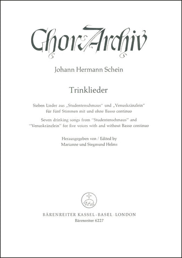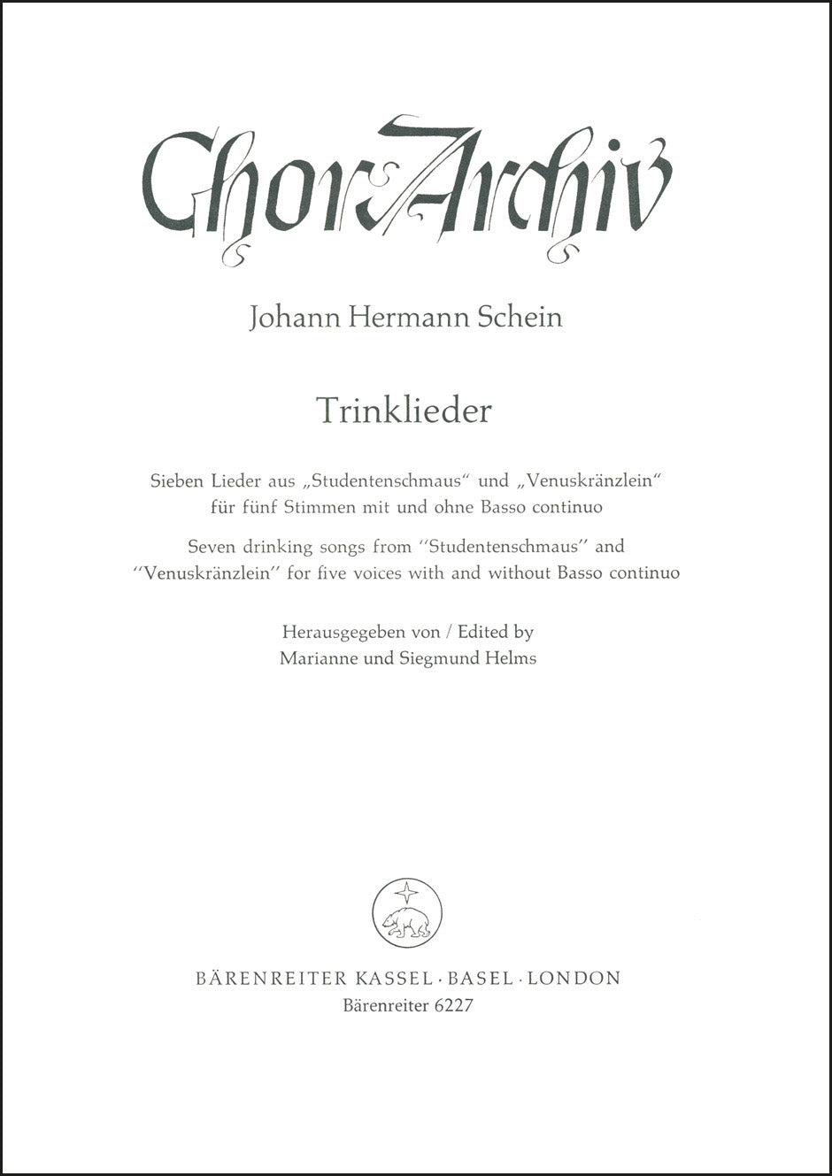 **Title**: Trinklieder | **Subtitle**: 7 Lieder für Chor oder Solostimmen, teilweise mit Basso continuo | **Misc Information**: aus "Studentenschmaus" und "Venuskränzlein" | **Composer / Author**: Schein, Johann Hermann | **Editor**: Helms, Marianne / Helms, Siegmund | **Edition Type**: Choral score, Anthology, Urtext edition | **Instrumentation**: Choir | **Scoring/ Instrumentation**: Mixed choir | **Binding**: Stapled | **Level of Difficulty**: 2.0 | **Weight**: 111.0 g | **Pages**: 24 S. | **Language**: EN | Sample: https://data.baerenreiter.com/NB/BA/BA06227_00_9790006477234_nb_lrg_01.jpg