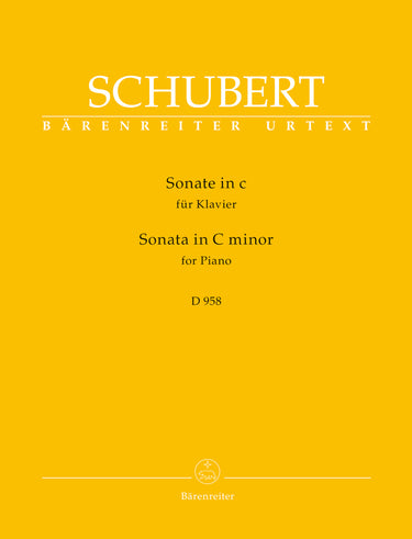 **Title**: Sonata for Piano in C minor D 958 | **Comments**: Replaces BA 5632 | **Comments on Version**: With notes on performance practice by Mario Aschauer | **Composer / Author**: Schubert, Franz | **Editor**: Litschauer, Walburga | **Edition Type**: Performance score, Urtext edition | **Instrumentation**: Piano | **Scoring/ Instrumentation**: Piano | **Binding**: Stapled | **Level of Difficulty**: 6.0 | **Printing**: 1st prinitng 2015 | **Weight**: 274.0 g | **Format**: 31,0 x 24,3 cm | **Pages**: XVI, 42 S. | **Language**: EN | Sample: https://data.baerenreiter.com/NB/BA/BA10869_00_9790006521081_nb_lrg_01.jpg