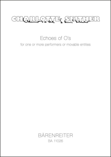 **Title**: Echoes of O's for one or more Performers or movable entities (2007) | **Composer / Author**: Seither, Charlotte | **Edition Type**: Score | **Binding**: Stapled | **Duration**: 00:03:00 | **Printing**: 2nd printing 2018 | **Weight**: 63.0 g | **Format**: 42,0 x 29,7 cm | **Pages**: 3 S. | **Language**: EN | Sample: https://data.baerenreiter.com/NB/BA/BA11026_00_9790006542642_nb_lrg_01.jpg