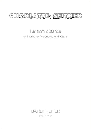 **Title**: Far from distance for Clarinet, Violoncello and Piano (2008) | **Composer / Author**: Seither, Charlotte | **Edition Type**: Score | **Instrumentation**: Clarinet, Violoncello, Piano | **Scoring/ Instrumentation**: Clarinet, Violoncello, Piano | **Binding**: in a folder | **Duration**: 00:11:00 | **Printing**: 1st printing 2012 | **Weight**: 206.0 g | **Format**: 42,0 x 29,6 cm | **Pages**: 16 S. | **Language**: EN | Sample: https://data.baerenreiter.com/NB/BA/BA11002_00_9790006542208_nb_lrg_01.jpg