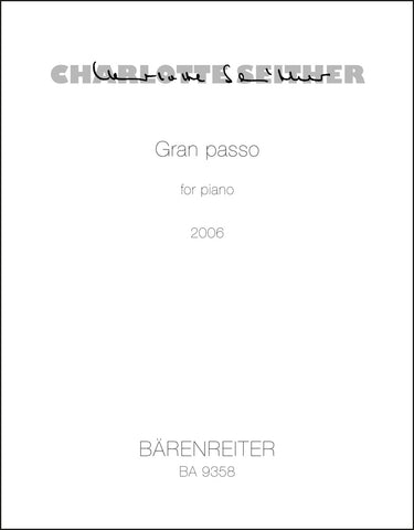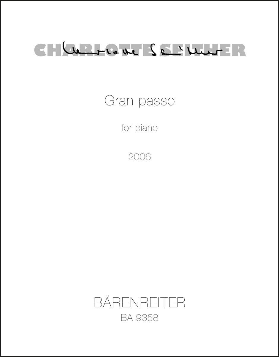 **Title**: Gran Passo for Piano (2006) | **Comments**: Uraufführung 16.11.2007, London | **Composer / Author**: Seither, Charlotte | **Edition Type**: Performance score | **Instrumentation**: Piano | **Scoring/ Instrumentation**: Piano | **Binding**: Stapled | **Duration**: 00:09:00 | **Printing**: 1. Aufl. 2007 | **Weight**: 112.0 g | **Format**: 34,5 x 27,0 cm | **Pages**: 16 S. | **Language**: EN | Sample: https://data.baerenreiter.com/NB/BA/BA09358_00_9790006535149_nb_lrg_01.jpg