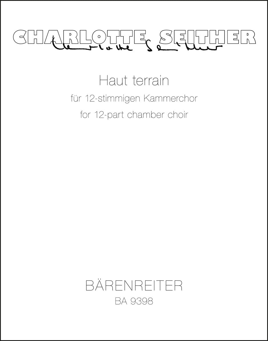 **Title**: Haut terrain for 12-voice chamber choir (2010) | **Composer / Author**: Seither, Charlotte | **Edition Type**: Choral score | **Instrumentation**: Choir | **Scoring/ Instrumentation**: Mixed choir | **Binding**: Stapled | **Duration**: 00:18:00 | **Printing**: 3rd printing 2013 | **Weight**: 233.0 g | **Format**: 32,6 x 25,6 cm | **Pages**: 48 S. | **Language**: EN | Sample: https://data.baerenreiter.com/NB/BA/BA09398_00_9790006541201_nb_lrg_01.jpg