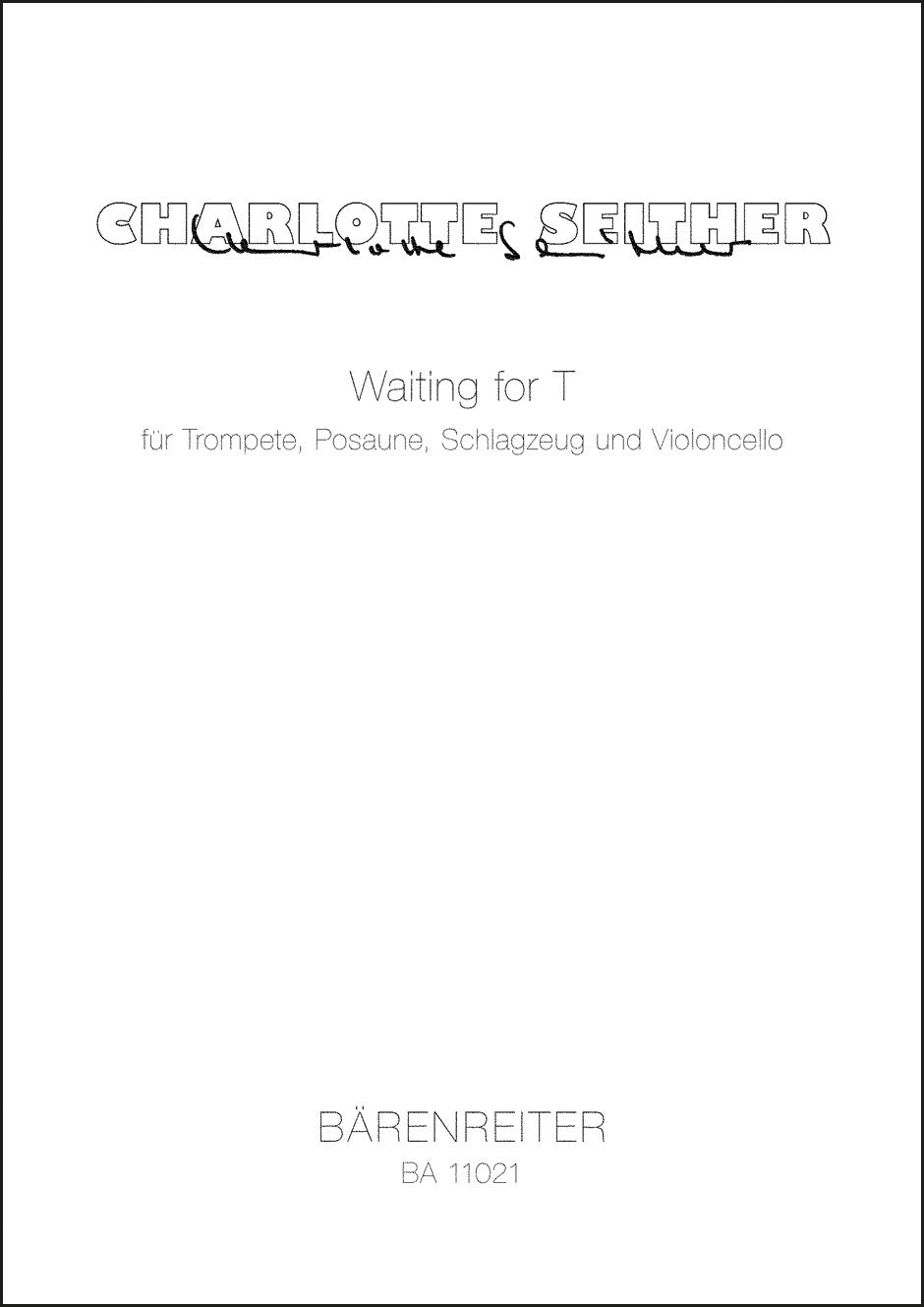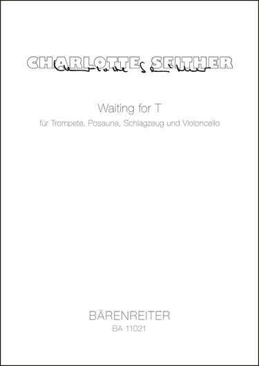 **Title**: Waiting for T for Trumpet, Trombone, Percussion and Violoncello (2009) | **Comments**: Uraufführung 17.07.2010, Stuttgart | **Composer / Author**: Seither, Charlotte | **Edition Type**: Score | **Instrumentation**: Orchestra | **Binding**: Ring stitching | **Duration**: 00:09:00 | **Weight**: 155.0 g | **Format**: 42,0 x 29,7 cm | **Pages**: 8 S. | **Language**: EN | Sample: https://data.baerenreiter.com/NB/BA/BA11021_00_9790006542277_nb_lrg_01.jpg