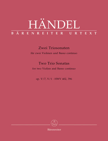 **Title**: 2 Triosonaten aus op.5 | **Subtitle**: Sonaten 7 B-dur HWV 402 und 1 A-dur HWV 396 | **Composer / Author**: Handel, George Frideric | **Editor**: Flesch, Siegfried | **Edition Type**: Performance score, Set of parts, Urtext edition, Anthology | **Instrumentation**: Violin, Basso continuo | **Scoring/ Instrumentation**: Violins (2), Basso continuo | **Binding**: Stapled | **Level of Difficulty**: 4.0 | **Printing**: 8. Aufl. 2021 | **Weight**: 219.0 g | **Format**: 31,0 x 24,3 cm | **Pages**: 24/8/8/8 S. | **Language**: EN | Sample: https://data.baerenreiter.com/NB/BA/BA04242_00_9790006505371_nb_lrg_01.jpg