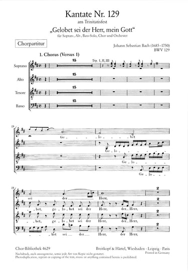 Cantata BWV 129 “Gelobet sei der Herr, mein Gott” | Trinity Sunday – Urtext | solos,mix ch,orch | solos: SAB – choir: SATB – 1.2(ob d’am).0.0 – 0.3.0.0 – timp – str(vl solo) – bc | 21' | Baroque | Cantata | Sheet Music | choral score | | | 8 | stapled | 19 x 27 cm