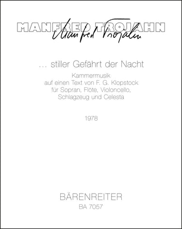 **Title**: ...stiller Gefährt der Nacht (1978) | **Subtitle**: Kammermusik auf einen Text von F. G. Klopstock für Sopran, Flöte, Violoncello, Schlagzeug und Celesta | **Comments**: Uraufführung 06.06.1978, Karlsruhe | **Composer / Author**: Trojahn, Manfred | **Libretto/Text by**: Klopstock, Friedrich Gottlieb | **Edition Type**: Score, Set of parts | **Scoring/ Instrumentation**: Soprano solo, Flute, Violoncello, Drums (Vibraphone, Tubular bells, Tam-Tam (gong) (2)), Celesta | **Binding**: Stapled | **Duration**: 00:14:00 | **Language of Text Part**: German | **Weight**: 360.0 g | **Format**: 34,0 x 27,2 cm | **Pages**: 41/3/6/4/6 S. | **Language**: EN | Sample: https://data.baerenreiter.com/NB/BA/BA07057_00_9790006484843_nb_lrg_01.jpg