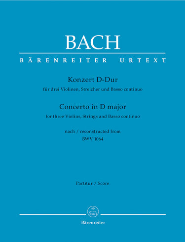 **Title**: Concerto for three Violins, Strings and Basso continuo in D major | **Subtitle**: Reconstructed from BWV 1064 | **Misc Information**: reconstructed from BWV 1064 | **Composer / Author**: Bach, Johann Sebastian | **Editor**: Fischer, Wilfried | **Preface**: Fischer, Wilfried | **Edition Type**: Score, Urtext edition | **Scoring/ Instrumentation**: Violins (3), String orchestra | **Binding**: Stapled | **Duration**: 00:22:00 | **Printing**: 7th printing 2021 | **Weight**: 209.0 g | **Format**: 31,0 x 24,3 cm | **Pages**: VI, 36 S. | **Language**: EN | Sample: https://data.baerenreiter.com/NB/BA/BA05148_00_9790006465804_nb_lrg_01.jpg