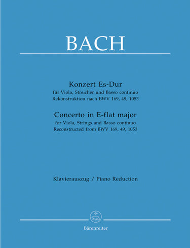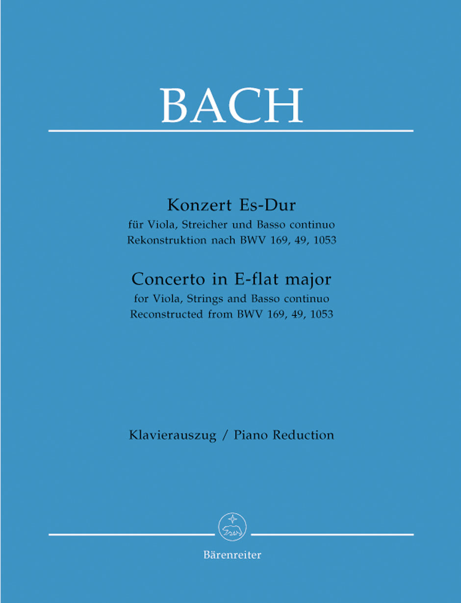 **Title**: Concerto for Viola, Strings and Bc in E-flat major | **Subtitle**: Reconstruction from BWV 169, 49, 1053 | **Composer / Author**: Bach, Johann Sebastian | **Arranger**: Töpel, Michael | **Editor**: Fischer, Wilfried | **Edition Type**: Piano reduction | **Instrumentation**: Viola, Strings, Basso continuo | **Binding**: Stapled | **Level of Difficulty**: 3.0 | **Printing**: 8th printing 2020 | **Weight**: 222.0 g | **Format**: 31,0 x 24,3 cm | **Pages**: 31/11 S. | **Language**: EN | Sample: https://data.baerenreiter.com/NB/BA/BA05149_90_9790006499458_nb_lrg_01.jpg