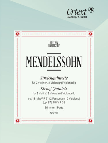 String Quintets Op. 18 MWV R 21, [Op. 87] MWV R 33 | Urtext based on the Leipzig Mendelssohn Complete Edition | 2vl,2va,vc | Chamber music | Strings | Quintet | Romantic | Sheet Music | set of parts | | | 232 | Folder | 23 x 30,5 cm