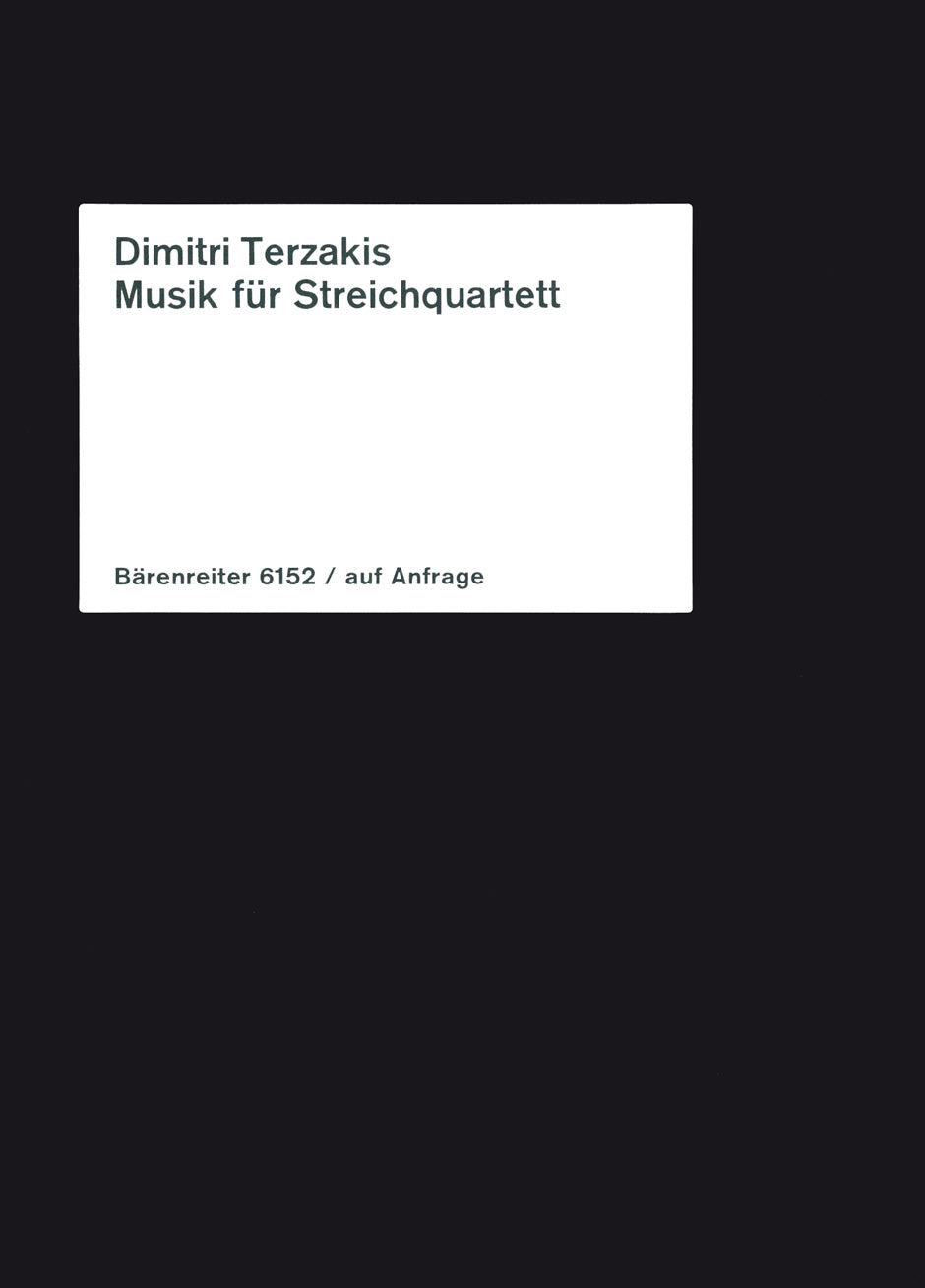 **Title**: Music for String Quartet (1969) | **Composer / Author**: Terzakis, Dmitri | **Edition Type**: Performance score | **Instrumentation**: String quartet | **Scoring/ Instrumentation**: Violins (2), Viola, Violoncello | **Binding**: Stapled | **Weight**: 84.0 g | **Pages**: 10 S. | **Language**: EN | Sample: https://data.baerenreiter.com/NB/BA/BA06152_00_9790006476145_nb_lrg_01.jpg