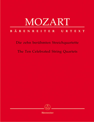**Title**: The Ten Celebrated String Quartets K. 387, 421, 458, 428, 464, 465, 499, 575, 589, 590 | **Composer / Author**: Mozart, Wolfgang Amadeus | **Editor**: Finscher, Ludwig | **Preface**: Finscher, Ludwig | **Edition Type**: Set of parts, Urtext edition, Anthology | **Instrumentation**: String quartet | **Scoring/ Instrumentation**: Violins (2), Viola, Violoncello | **Binding**: in a folder | **Level of Difficulty**: 4.0 | **Printing**: 17th printing 2021 | **Weight**: 1233.0 g | **Format**: 31,0 x 24,3 cm | **Pages**: 85/80/72/70 S. | **Language**: EN | Sample: https://data.baerenreiter.com/NB/BA/BA04750_00_9790006455454_nb_lrg_01.jpg