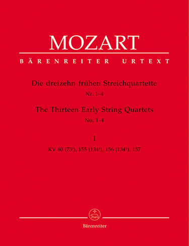 **Title**: The Thirteen Early String Quartets, Volume I K. 80, 155, 156, 157 | **Composer / Author**: Mozart, Wolfgang Amadeus | **Editor**: Füssl, Karl Heinz / Plath, Wolfgang / Rehm, Wolfgang | **Edition Type**: Set of parts, Urtext edition, Anthology | **Instrumentation**: String quartet | **Scoring/ Instrumentation**: Violins (2), Viola, Violoncello | **Binding**: in a folder | **Level of Difficulty**: 4.0 | **Printing**: 14th printing 2022 | **Weight**: 343.0 g | **Format**: 31,0 x 24,5 cm | **Pages**: 19/19/19/19 S. | **Language**: EN | Sample: https://data.baerenreiter.com/NB/BA/BA04847_00_9790006456949_nb_lrg_01.jpg