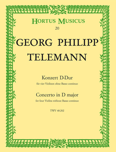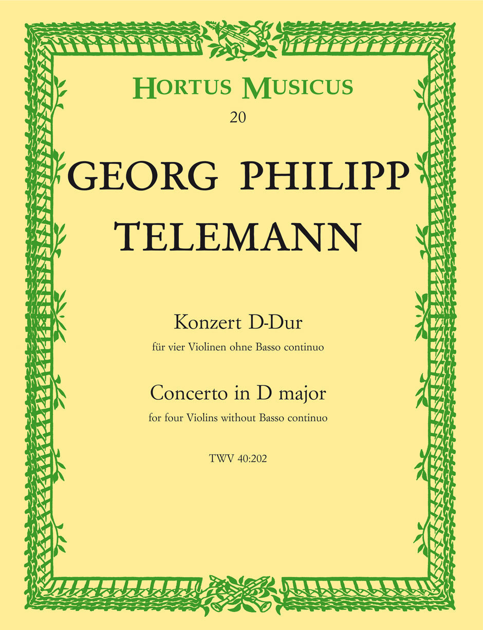 **Title**: Concerto for four Violins without Basso continuo in D major TWV 40:202 | **Composer / Author**: Telemann, Georg Philipp | **Editor**: Engel, Hans | **Edition Type**: Score, Set of parts | **Instrumentation**: Violin | **Scoring/ Instrumentation**: Violins (4) | **Binding**: Stapled | **Level of Difficulty**: 3.0 | **Printing**: 22nd printing 2023 | **Weight**: 82.0 g | **Format**: 30,0 x 23,0 cm | **Pages**: 7/2/2/2/2 S. | **Language**: EN | Sample: https://data.baerenreiter.com/NB/HM/HM00020_00_9790006000296_nb_lrg_01.jpg