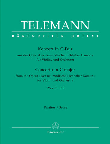 **Title**: Concerto for Violin and Orchestra in C major TWV 51:C 3 | **Misc Information**: From the opera "Der neumodische Liebhaber Damon" | **Composer / Author**: Telemann, Georg Philipp | **Editor**: Baselt, Bernd | **Edition Type**: Score, Urtext edition | **Scoring/ Instrumentation**: Violin, Orchestra | **Binding**: Stapled | **Weight**: 83.0 g | **Format**: 30,0 x 22,5 cm | **Pages**: IV, 16 S. | **Language**: EN | Sample: https://data.baerenreiter.com/NB/BA/BA08659_00_9790006526543_nb_lrg_01.jpg