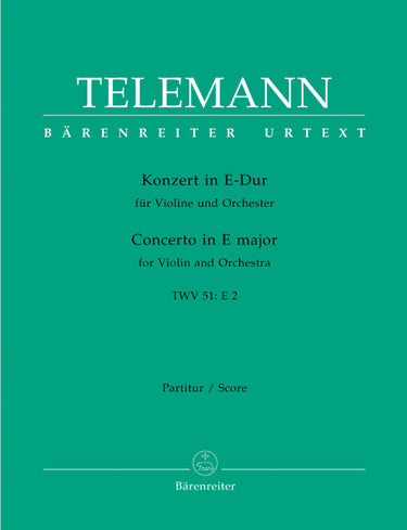 **Title**: Concerto for Violin and Orchestra in E major TWV 51:E2 | **Composer / Author**: Telemann, Georg Philipp | **Editor**: Kross, Siegfried | **Edition Type**: Score, Urtext edition | **Instrumentation**: Violin, Viola, Basso continuo | **Scoring/ Instrumentation**: Violin, Orchestra | **Binding**: Stapled | **Weight**: 112.0 g | **Format**: 30,1 x 23,1 cm | **Pages**: IV, 20 S. | **Language**: EN | Sample: https://data.baerenreiter.com/NB/BA/BA08654_00_9790006521418_nb_lrg_01.jpg