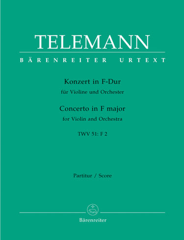 **Title**: Concerto for Violin and Orchestra in F major TWV 51:F2 | **Composer / Author**: Telemann, Georg Philipp | **Editor**: Kross, Siegfried | **Edition Type**: Score, Urtext edition | **Instrumentation**: Violin, Viola, Basso continuo | **Scoring/ Instrumentation**: Violin, Orchestra | **Binding**: Stapled | **Weight**: 98.0 g | **Format**: 30,1 x 23,1 cm | **Pages**: IV, 16 S. | **Language**: EN | Sample: https://data.baerenreiter.com/NB/BA/BA08655_00_9790006521425_nb_lrg_01.jpg