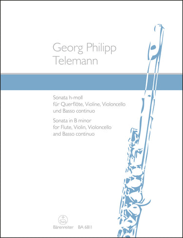 **Title**: Sonata for Flute, Violin, Violoncello and Basso continuo in B minor TWV 43:h1 | **Composer / Author**: Telemann, Georg Philipp | **Editor**: Kölbel, Herbert | **Edition Type**: Performance score, Set of parts | **Instrumentation**: Flute, String instruments, Basso continuo | **Scoring/ Instrumentation**: Flute, Violin, Violoncello, Basso continuo | **Binding**: Stapled | **Weight**: 146.0 g | **Format**: 30,0 x 23,0 cm | **Pages**: 19/4/4/4 S. | **Language**: EN | Sample: https://data.baerenreiter.com/NB/BA/BA06811_00_9790006482825_nb_lrg_01.jpg