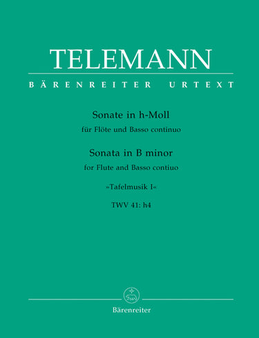 **Title**: Sonate for Flute and Basso continuo no. 1 in B minor TWV 41:h4 | **Subtitle**: Tafelmusik I | **Composer / Author**: Telemann, Georg Philipp | **Editor**: Hinnenthal, Johann Philipp | **Edition Type**: Performance score, Part, Urtext edition | **Instrumentation**: Flute, Basso continuo | **Scoring/ Instrumentation**: Flute, Basso continuo | **Binding**: Stapled | **Level of Difficulty**: 3.0 | **Printing**: 10th printing 2023 | **Weight**: 131.0 g | **Format**: 31,0 x 24,3 cm | **Pages**: 11/5/4 S. | **Language**: EN | Sample: https://data.baerenreiter.com/NB/BA/BA03537_00_9790006436637_nb_lrg_01.jpg